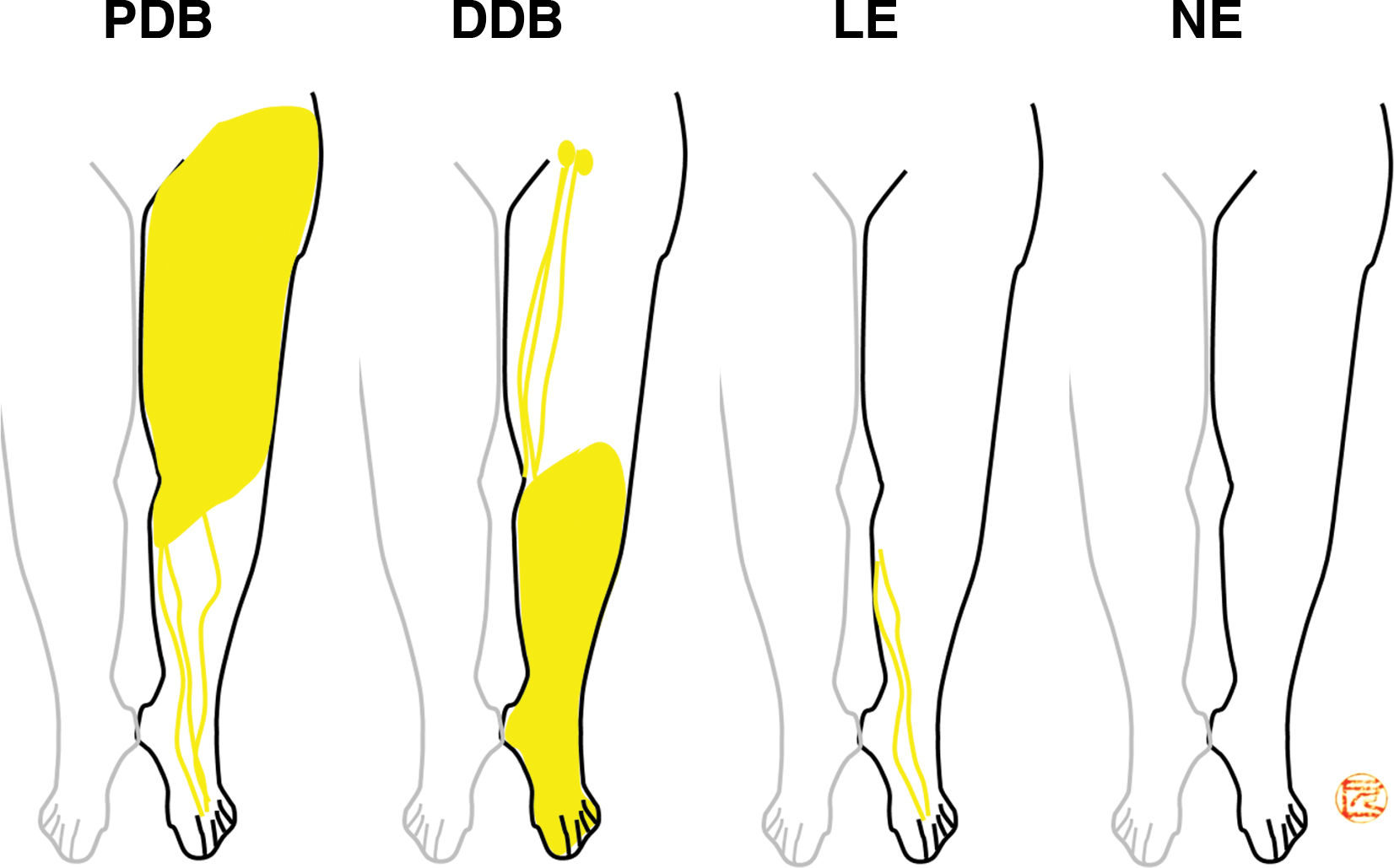Since primary lymphedema has a wide variety of etiologies, not only lymph flow obstruction, ICG severity stage is used mainly for secondary lymphedema. However, for primary lymphedema with DB patterns (proximal and distal DB types), the ICG stage can be applied for severity staging.