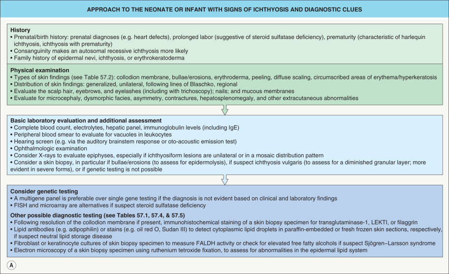 Establishing the correct diagnosis in a patient with ichthyosis is a prerequisite for making prognostic predictions, planning therapy, and offering genetic counseling. This may pose a considerable challenge, as these disorders are uncommon and have overlapping clinical spectra. However, a systematic approach utilizing clinical and laboratory-based clues can aid in making the diagnosis ( Fig. 57.1 ).