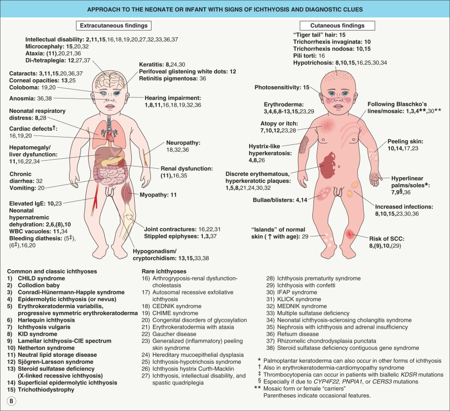 This strategy allows the clinician to identify many ichthyoses based on their key features. For most conditions, the molecular etiology is known and genetic testing can confirm the diagnosis, allow more precise genetic counseling, and provide the basis for prenatal testing. However, despite advances in our understanding of the pathomechanisms underlying ichthyoses, effective therapies are available for only a small subset of these conditions. Hopefully, ongoing research will lead to the development of targeted treatments that will be of greater benefit to ichthyosis patients. Patient organizations such as the Foundation for Ichthyosis and Related Skin Types (FIRST; www.firstskinfoundation.org ) can provide valuable support to affected individuals and their families.