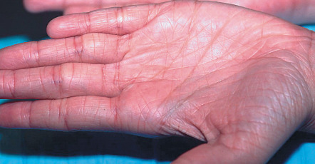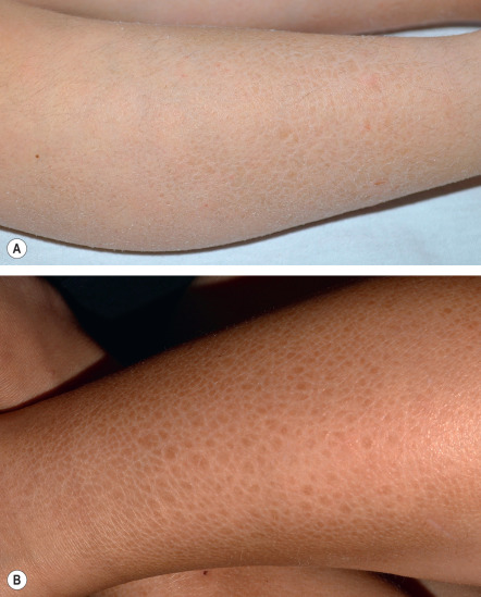 Ichthyosis vulgaris in FLG heterozygotes is usually not evident at birth. Dry skin and mild to moderate scaling appear during infancy or early childhood. Fine, white, flaky scales typically develop on the extremities, especially the extensor surfaces ( Fig. 57.2 ). The groin and flexural areas are spared because of increased humidity in those regions. On the lower legs, the scales are often larger with an adherent center and detached, outward-turning edges. Mild hyperkeratosis of the palms and soles leading to accentuated skin markings (hyperlinearity) is common ( Fig. 57.3 ).
