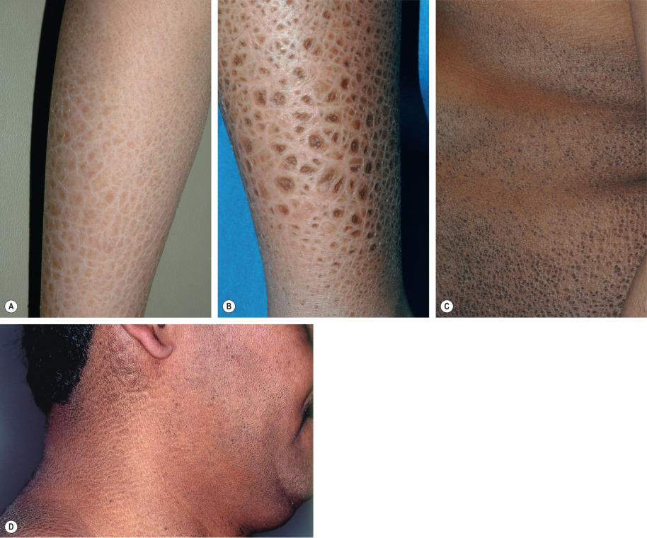 In ~90% of affected boys, steroid sulfatase deficiency presents during the neonatal period with mild erythroderma and generalized peeling, often with exfoliation of large, translucent scales. The typical polygonal, dark-brown, adherent scales develop later during infancy or childhood and are distributed symmetrically on the extremities, trunk, and neck ( Fig. 57.5 ). The scales are occasionally grayish or white, and they tend to be larger on the lower extremities. Preauricular involvement is highly characteristic and the neck is almost invariably affected, which has resulted in the descriptive term “dirty neck disease” (see Fig. 57.5D ); other flexural areas may or may not be involved. Fine scaling of the scalp is frequently seen during early childhood but diminishes over time. The palms, soles, and remainder of the face are characteristically spared. The ichthyosis tends to improve in the summer; however, in contrast to ichthyosis vulgaris, it does not significantly subside with age.