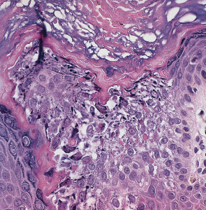 Histopathologic abnormalities include orthokeratotic hyperkeratosis, acanthosis, and vacuolization of the granular cell layer that occasionally leads to superficial intraepidermal separation. By electron microscopy, clumping of tonofilaments is present but limited to the upper spinous and granular cell layers.