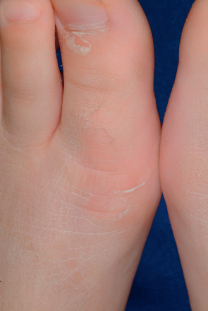 The phenotype is milder than in classic EI. At birth, the skin may appear normal or show mild blistering. Trauma-induced small blisters on the extremities occur during infancy but usually subside by early childhood, while hyperkeratosis develops. Predilection sites are the skin overlying the joints, the flexures, and the dorsa of the hands and feet ( Fig. 57.8 ), always sparing the palms and soles. The skin may appear ridged, shiny, or lichenified. A characteristic feature is superficially denuded areas with collarette-like borders, described as “molting” or “Mauserung”, which develop due to superficial blistering and shedding of the stratum corneum.