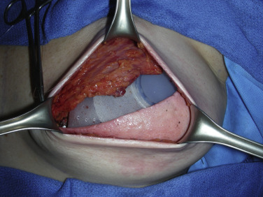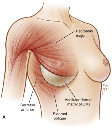 Additionally, by utilizing ADM as a tissue supplement over the inferior pole, further muscle dissection is spared, which leads to less postoperative pain, and a more anatomically precise pocket can be defined ( Fig. 10.2 ). The higherintra operative fill volume also addresses the retained skin in skin-sparing mastectomies. These benefits ultimately result in increased control by the surgeon over the reconstruction as well as final aesthetic outcome for the patient.
