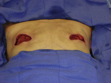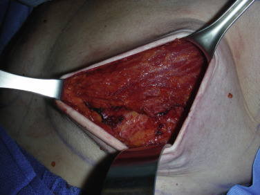 Once the initial intraoperative markings are complete, the lateral edge of the pectoralis major muscle is identified. Using electrocautery, the dissection is started from the lateral extent. After the plane is identified between pectoralis major and the underlying chest wall, blunt finger dissection can be used to continue the dissection and elevate the muscle. It is common to encounter several perforators during the dissection, which should be cauterized.