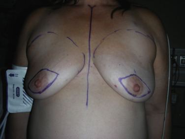 Prior to surgery, the patient is marked in the standing position. The anatomic landmarks include the sternal notch, midline, clavicle, inframammary fold, and anterior axillary line. Specific attention must be paid to the inframammary fold as the inferior border of the mastectomy. The inframammary fold along with the medial, lateral and superior borders of the breast are marked. The skin-sparing skin pattern is also marked ( Fig. 10.4 ). Several options of expanders and acellular dermal matrix sizes are available but the final decision is made by the plastic surgeon intraoperatively after the mastectomy is completed. This ensures that each patient receives a reconstruction tailored to her individual needs.