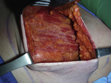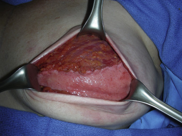 It is routine at our institution to begin reconstruction after the mastectomy is complete. The entire chest and axilla are re-prepped with betadine. It is always wise to inspect the mastectomy flaps for signs of thermal injury or full-thickness compromise ( Fig. 10.5 ). Often this can be mitigated with direct excision, but the decision to proceed must be made at this juncture, as compromised skin flaps may compromise the reconstruction entirely. Skin perfusion imaging may serve as an adjunct to clinical exam in determining skin flap viability. In addition, the quality of the pectoralis major muscle should also be inspected ( Fig. 10.6 ).