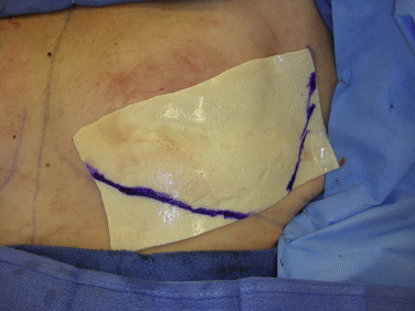 Once the pectoralis major is sufficiently elevated ( Fig. 10.7 ), the sizing of the ADM can be approximated. The senior author uses rectangular ADM measuring 16 cm × 8 cm ultra-thick, and designs the matrix to lay parallel to the fibers of the pectoralis muscle. The excess corners of the dermal matrix are then cut to specification based on the preoperative markings along the IMF and lateral breast border ( Fig. 10.8 ).