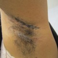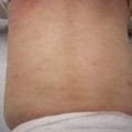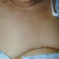 Pink-crusted plaques are present in the antecubital space; a small pustule is noted, as are focal hemorrhagic crusts. This represents both an innate and an adaptive immune response