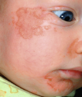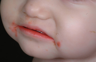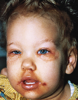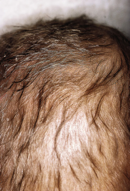 Several autosomal recessive disorders may manifest as an acrodermatitis enteropathica-like eruption, because they require biotin as a cofactor. Cheilitis and diffuse erythema with erosions and desquamation are features of methylmalonic acidemia before therapeutic amino acid restriction. Inherited biotin deficiency also occurs in two forms of multiple carboxylase deficiency, one of which presents acutely during the neonatal period (neonatal form), and the other that presents during early infancy (juvenile form). These disorders occur in up to 1 : 40,000 births. Both forms usually show a sharply marginated, brightly erythematous scaling eruption of the periorificial areas, scalp, eyebrows, and eyelashes ( Fig. 24-4 ). Alopecia can manifest as hair thinning or total alopecia. Secondary candidiasis is not uncommon. The neonatal form, which results from deficiency of holocarboxylase synthetase, appears in the first few weeks of life with metabolic acidosis, ketosis, and rarely, cutaneous manifestations. Patients show feeding and breathing difficulties, seizures, hypotonia, and lethargy; without early diagnosis and treatment, they usually die. The juvenile form of the disorder, which first manifests at 2 months of age or older, is the result of deficiency of biotinidase, which is required for recycling of endogenous biotin. Patients have low levels of biotin in the blood and urine and impaired biotin absorption and/or transport. In addition to the cutaneous features, the juvenile form is characterized by seizures (especially myoclonic spasms that respond partially to antiepileptics), hyperventilation or apnea, recurrent infections (including candidal skin infections), keratoconjunctivitis, ataxia, hypotonia, glossitis, and life-threatening acidosis and massive ketosis. More than 50% of patients whose disease is not recognized early have hearing loss that does not improve with biotin therapy.