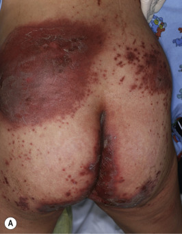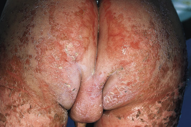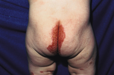 The basic cutaneous lesion of acrodermatitis enteropathica is an erythematous, scaling, crusted, psoriasiform, eczematous, or vesiculobullous eruption (see Fig. 2-29 ). Lesions tend to be localized around the body orifices (mouth, nose, ears, eyes, and perineum; Fig. 24-1 ) and symmetrically located on the buttocks ( Fig. 24-2 ) and extensor surface of major joints (elbows, knees, hands, and feet), the scalp, and the fingers and toes (hence the term acrodermatitis ). On the face, the eroded and crusted peribuccal plaques may appear impetiginized, and secondary infection with Candida albicans is common. When the fingers and toes are involved, there is marked erythema and swelling of the paronychial tissues, often with subsequent nail deformity. If unrecognized or untreated, acrodermatitis enteropathica follows an intermittent but relentlessly progressive course, and as a consequence of general disability, infection, or both, commonly ends in death.