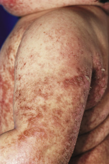 The clinical picture consists of a blanching erythema with an overlying reddish-brown scale that shows a sharply marginated raised edge. This edge resembles paint that is lifting up and about to peel off, leading to the term flaky paint dermatosis ( Figs. 24-5 and 24-6 ). In contrast to lesions of pellagra, the dermatosis seldom appears on areas exposed to sunlight and tends to spare the feet and dorsal areas of the hands. Photosensitivity, purpura, and excessive bruisability may also be present. Other associated features include changes in mental behavior, anorexia, apathy, irritability, growth retardation, and fatty infiltration of the liver with hypoproteinemia. As a result of the hypoalbuminemia, affected children show edema of the face (moon facies) ( Fig. 24-7 ), feet, and abdomen (potbelly appearance).
