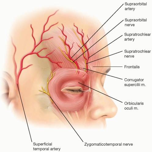 FIG 1 • Forehead anatomy. (Reprinted from Guyuron B. Forehead rejuvenation. In: Guyuron B, Eriksson E, Persing J, eds. Plastic Surgery: Indications and Practice. Philadelphia, PA: Saunders Elsevier, 2009:1409-1426, with permission from Elsevier.)