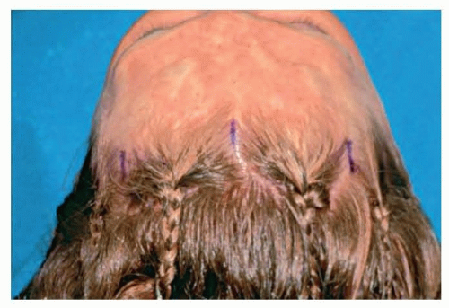 FIG 2 • Markings and hair braiding for endoscopic brow lift. (Reprinted from Guyuron B. Forehead rejuvenation. In: Guyuron B, Eriksson E, Persing J, eds. Plastic Surgery: Indications and Practice. Philadelphia, PA: Saunders Elsevier, 2009:1409-1426, with permission from Elsevier.)