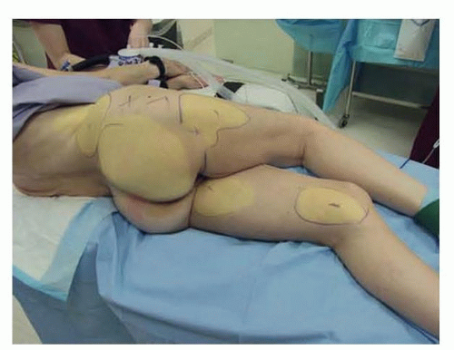 This position can be used to simultaneously harvest fat from multiple sites including the hip, waist, flank, upper buttocks, outer and inner thigh, and knees (FIG 3). With practice, a