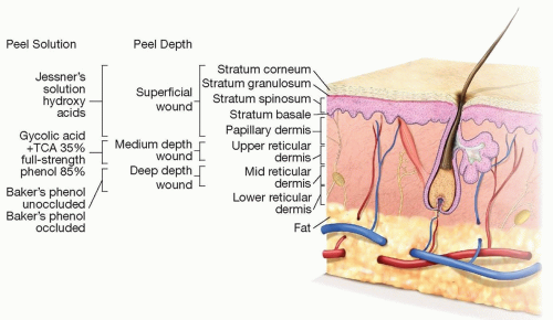 Intermediate and deep chemical peeling imparts injury to the epidermis and varying depths of the dermis in a controlled manner in efforts to stimulate epidermal regrowth. Peeling has been shown to rejuvenate facial skin and has been used to treat acne, rhytides, and photodamage.1
