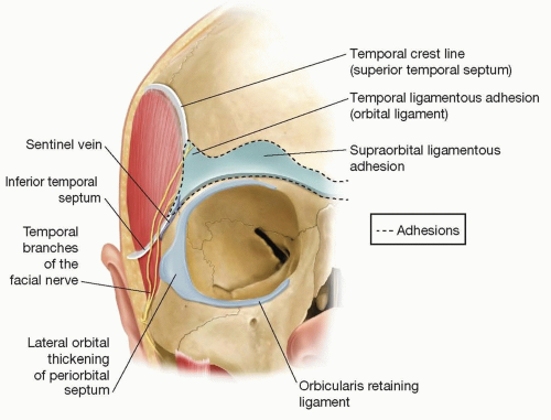 • The surgical significance of the temporal crest line is that overlying fascial layers are tethered to bone in a band immediately medial to the palpable ridge. This has been called the zone of fixation or the zone of adhesion.2,3 Inferiorly, where the ridge approaches the orbital rim, the fixation becomes broader and denser, forming the orbital ligament, also known as the temporal ligamentous adhesion. Regardless of the surgical technique used, when a full-thickness forehead flap is mobilized, all fascial attachments to bone must be released, including the zone of adhesion and the orbital ligament, plus attachments to the supraorbital rim and lateral orbital rim.4