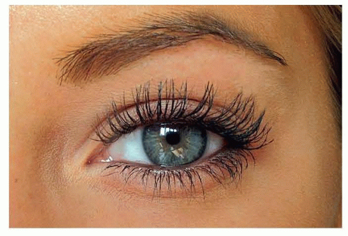 FIG 2 • The attractive eye exhibits a modest amount of visible upper lid (“tarsal show”); this dimension is about one-third of the distance from the lash line to the lower border of the eyebrow. The brow itself starts medially over the supraorbital rim and vertically in line with the medial canthus. It angles gently upward, peaking about two-thirds of the way along the brow toward its lateral extent. In females, this peak is at or lateral to the lateral limbus of the eye. In men, this peak is minimal or absent. Laterally, the “tail” of the brow should end at a higher point than the medial end of the brow.