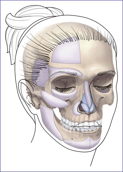 Since the skeletal infrastructure of the human face is fundamental to its appearance, its surgical change can be powerful. Conceptually, autogenous bone would be the best material to restore or augment the craniofacial skeleton because it has the potential to be vascularized and, then, incorporated into the facial skeleton. In time, it can be biologically indistinguishable from the adjacent native skeleton. Practically, the use of autogenous bone to augment facial skeletal contours is limited. Donor site morbidity as well as the time and operative costs associated with autogenous bone graft harvest can be significant. Furthermore, the inevitable resorption and the poor handling characteristics of autogenous bone grafts limit the quality and predictability of the aesthetic result. With the exception of interposition grafts used to reconstruct segmental load-bearing defects of the maxilla and mandible, the majority of craniofacial skeleton replacements and, particularly, facial skeleton augmentation is done with alloplastic implants. A diagrammatic survey of the alloplastic implants used for facial skeletal reconstruction and enhancement is presented in Fig. 1.1 . Subsequent chapters will address each anatomic area.