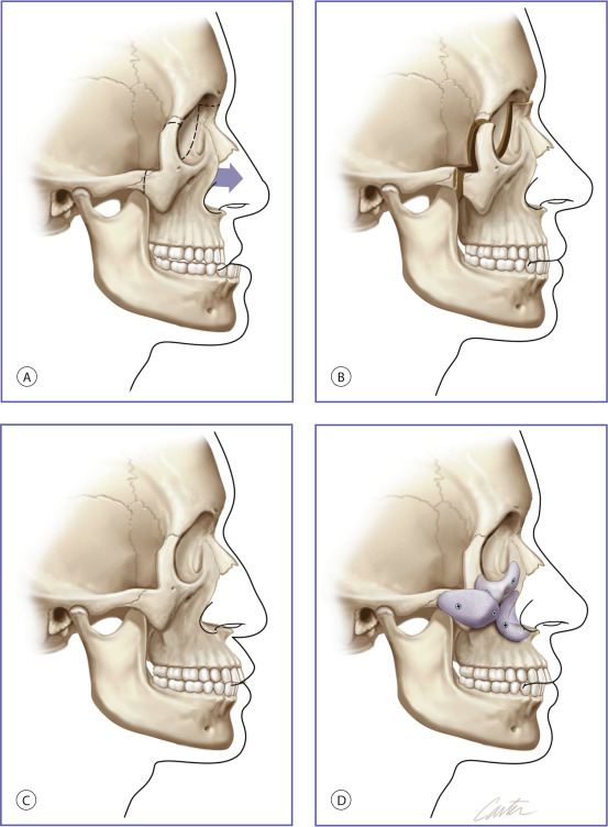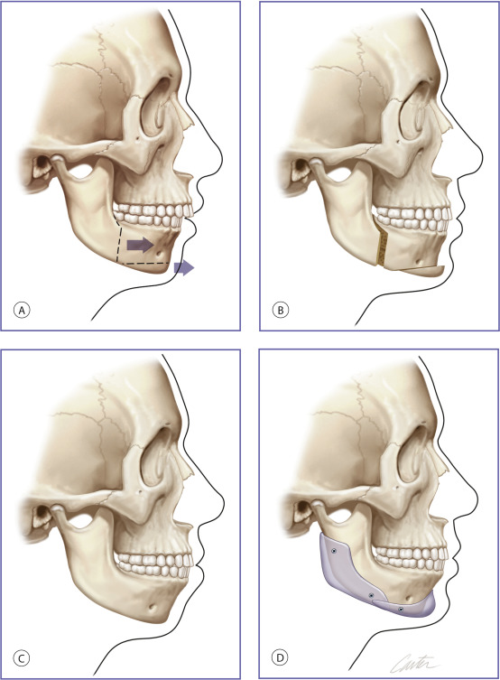 Craniofacial deformities that are disfiguring and are of functional consequence to vision, breathing, and mastication usually require skeletal osteotomies and rearrangement as treatment. Less severe midface and mandibular hypoplasia are common facial skeletal variants. In patients with these morphologies, occlusion is normal or has been compensated by orthodontics. These patients have neither respiratory nor ocular compromise. In skeletally deficient patients whose occlusion is normal or has been previously normalized by orthodontics, skeletal repositioning would necessitate additional orthodontic tooth movement. Such a treatment plan is time-consuming, costly, and potentially morbid. It is, therefore, appealing to few patients. In these patients, the appearance of skeletal osteotomies and rearrangements can be simulated through the use of facial implants. Diagrammatic representations of how implant surgery can mimic the appearance of skeletal osteotomies are shown in Figs. 1.3 and 1.4 .