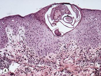 The scrapings are transferred directly to a glass slide, a drop of potassium hydroxide is added, and a coverslip is applied. If diagnostic material is not found, the preparation is gently heated and the coverslip is pressed to separate squamous cells. Feces remain intact for short periods but may be dissolved quickly when the mount is heated. Skin biopsy is rarely necessary to make the diagnosis.
