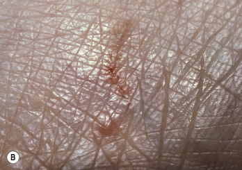 Initially, the areas most apt to contain burrows are observed. To enhance burrows for better viewing, the surface should be touched with a drop of mineral or immersion oil or a blue or black fountain or felt-tip pen (the ink method dyes the burrow; surface ink may be removed with an alcohol swab). The burrow absorbs the ink and is highlighted as a dark line ( Fig. 15.17 ). The accentuated lesions are smoothly scraped away with a curved no. 15 scalpel blade and transferred to a glass microscope slide for examination.
