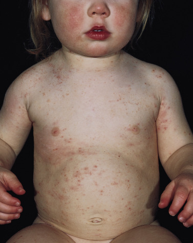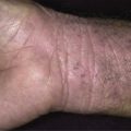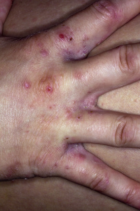 Infants, more frequently than adults, have widespread involvement. This may occur because the diagnosis is not suspected and proper treatment is delayed while medication is given for other suspected causes of itching, such as dry skin, eczema, and infection. Infants occasionally are infested on the face and scalp, something rarely seen in adults. Vesicles are common on the palms and soles; this is a highly characteristic sign of scabies in infants (see Fig. 15.6 ). Secondary eczematization and impetiginization are common, but burrows are difficult to find. Nodules may be seen in the axillae and diaper area.