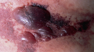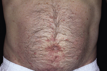 Secondary lesions result from infection or are caused by scratching. They often dominate the clinical picture. Pinpoint erosions are the most common secondary lesions ( Fig. 15.6 ). Pustules are a sign of secondary infection. Scaling, erythema, and all stages of eczematous inflammation occur as a response to excoriation or to irritation caused by overzealous attempts at self-medication. Nodules occur in covered areas such as the buttocks, groin, scrotum, penis, and axillae ( Fig. 15.7 ). The 2 to 10 mm indolent, red papules and nodules sometimes have slightly eroded surfaces, especially on the glans penis ( Fig. 15.8