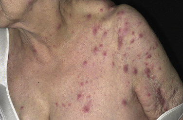 Elderly patients may have few cutaneous lesions but itch severely. The decreased immunity associated with advanced age may allow the mites to multiply and survive in great numbers. These patients have few cutaneous lesions other than excoriations, dry skin, and scaling, but they experience intense itching. Eventually papules and nodules appear and may become numerous ( Figs. 15.13 to 15.15 ). Entire nursing home populations may be infested (see Treatment and Management section , below). A skin scraping from any scaling area may show numerous mites at all stages of development.