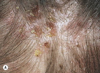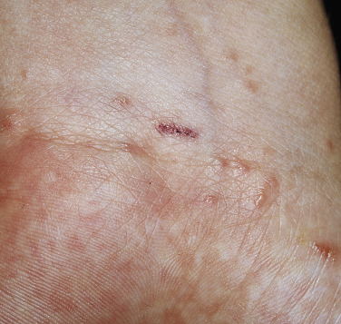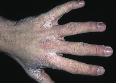 The term Norwegian scabies was first used in 1848 to describe an overwhelming scabies infestation of patients with Hansen disease. In patients with crusted scabies, lesions tend to involve hands and feet with asymptomatic crusting rather than the typical inflammatory papules and vesicles ( Fig. 15.16 ). There is thick, subungual, keratotic material and nail dystrophy. Digits and sites of trauma may show wart-like formations. Gray scales and thick crusts may be present over the trunk and extremities. Desquamation of the facial skin may occur. The hair may shed profusely. Crusted scabies occurs in people with neurologic or mental disorders (especially Down syndrome), senile dementia, nutritional disorders, infectious diseases, leukemia, and immunosuppressive disorders (such as patients with acquired immunodeficiency syndrome [AIDS]). Itching may be absent or severe. A lack of immunity and indifference to pruritus have been suggested as reasons for the development of this distinct clinical picture. A mineral oil or potassium hydroxide examination of crusts shows numerous mites at all stages of development.