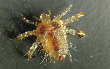 -mm long and has a flattened, oval body with wrinkle-like, transverse corrugations and eight legs ( Fig. 15.1 ). The front two pairs of legs have claw-shaped suckers and the two rear pairs end in long, trailing bristles. The digestive tract fills a major portion of the body and is readily observed when the mite is seen in cross-section of histologic specimens ( Fig. 15.2A ).