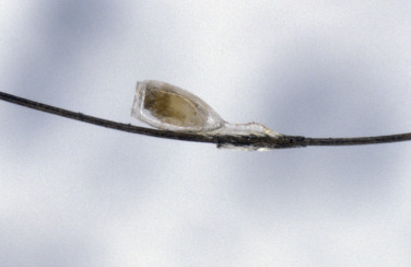 Ticks perch on grass tips and bushes and wait for a warm-blooded host to pass by. They insert their recurved teeth into the skin, produce a glue-like secretion that tightens their grip, suck blood ( Fig. 15.31 ), and become engorged, sometimes tripling in size. Hard ticks may remain attached to the host for up to 10 days, whereas soft ticks release in a few hours. The bite itself is painless, but within hours an urticarial wheal appears at the puncture site and may cause itching. Ticks may go unnoticed, particularly in children, for several hours after attachment to an inconspicuous area such as the scalp.