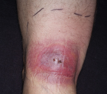 The first and most characteristic cutaneous change in necrotic arachnidism, or loxoscelism, is the development and rapid expansion of a blue-gray, macular halo around the puncture site; this halo represents local hemolysis. Violaceous skin discoloration is an indication of incipient necrosis and can be used as a guide to early initiation of therapy, when it is most effective. A cyanotic pustule or vesicle/bulla may also appear at the bite site. The lesion may have an oblong, irregular configuration area at the bite site and a sudden increase in tenderness. At this stage, the superficial skin may be rapidly infarcting and the pain is severe. The necrotizing, blue macule widens and the center sinks below the normal skin surface (“sinking infarct”) ( Fig. 15.30 ). The extent of the infarct is variable. Most patients experience localized reactions, but the depth of the necrotic tissue may extend to the muscle and over broad areas of skin, sometimes involving most of an extremity. The dead tissue sloughs, leaving a deep, indolent ulcer with ragged edges. Ulcers take weeks or months to heal; scarring is significant.