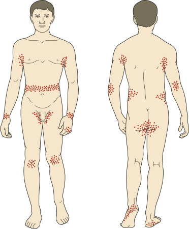 Lesions of scabies are typically found in the finger webs, wrists, extensor surfaces of the elbows and knees, sides of the hands and feet, axillary areas, buttocks, waist area, and ankle area ( Figs. 15.9