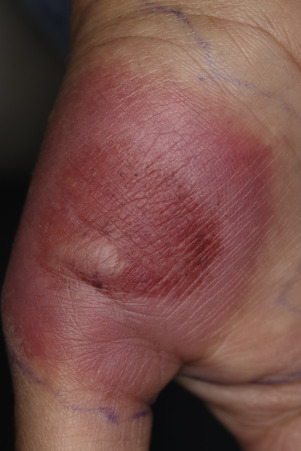 | Moderate | Erythema, mild edema, vesicle, necrosis <1 cm 2 | Pain, other | Add analgesic, antibiotic; consider dapsone |