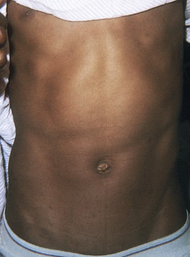 The bite may produce an immediate, sharp pain or may be painless. The subsequent reaction is minimal, with slight swelling and the appearance of a set of small, red fang marks. The symptoms that follow are caused by lymphatic absorption and vascular dissemination of the neurotoxin and are collectively known as latrodectism. The most common presenting complaints are generalized abdominal, back, and leg pain. Fifteen minutes to 2 hours after the bite, a dull muscle cramping or severe pain with numbness gradually spreads from the inoculation site to involve the entire torso but is usually more severe in the abdomen and legs. Any or all of the skeletal muscles may be involved. Severe abdominal pain and spasm simulating a surgical abdomen are the most prominent and distressing features of latrodectism ( Fig. 15.27