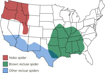 The brown recluse spider, Loxosceles reclusa (“fiddle-back spider”), is small, approximately 1.5 cm in overall length. Its color ranges from yellowish tan to dark brown. A characteristic dark, violin- or fiddle-shaped marking is located on the spider’s back. The broad base of the violin is near the head and the violin stem points toward the abdomen ( Fig. 15.28 ). The spider is a timid recluse, avoiding light and disturbances and living in dark areas (under woodpiles and rocks and inside human habitations, often in closets, behind picture frames, under porches, and in barns and basements). Its web is small, haphazard, and woven in cracks, crevices, or corners. It bites only when forced into contact with the skin, such as when a person puts on clothing in which the spider is residing or rummages through stored material harboring the spider. The brown recluse is usually found in the southern half of the United States, but some have been found as far north as Connecticut. The hobo spider, Tegenaria agrestis, has been implicated in necrotic lesions in the Pacific Northwest of the United States ( Fig. 15.29