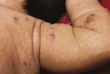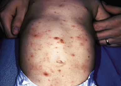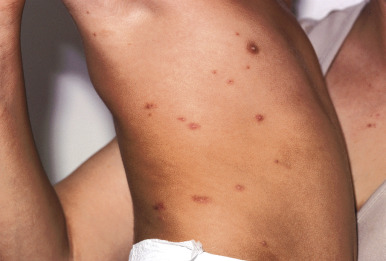 Scabies nodules are red-brown nodules ( Figs. 18-9 and 18-10 ) that represent a vigorous hypersensitivity response of the host. They occur most commonly on the trunk, axillary regions, and genitalia and are seen primarily in infants. Although they eventually resolve, scabies nodules may be present for several months. They are occasionally misdiagnosed (both clinically and histologically) as signs of a neoplastic disorder (i.e., leukemia or lymphoma cutis).