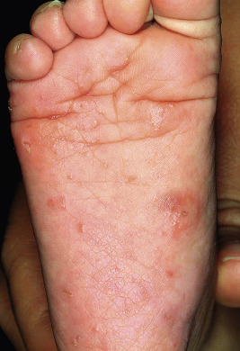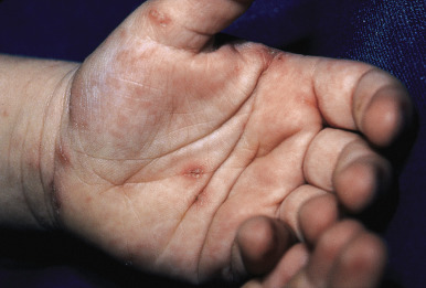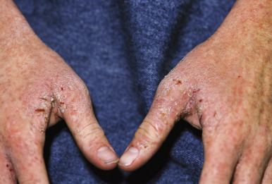 Crusted, or Norwegian, scabies is a form of the disorder that presents as scaly, dermatitic papules or plaques. Crusted scabies may be localized or generalized and occurs primarily in immunocompromised patients (especially those with HIV infection) and in those who are mentally retarded or physically incapacitated. The lesions of this disorder may mimic eczema ( Fig. 18-11 ), psoriasis, warts, or a drug reaction, and nail dystrophy may be present. Crusted scabies is commonly misdiagnosed and mismanaged. A delay in the diagnosis of crusted scabies may lead to the inadvertent exposure of multiple physical contacts. The lesions may become heavily crusted and hyperkeratotic and often are minimally pruritic. Crusted scabies is extremely contagious, given the large numbers of mites (thousands) that may be present. In classic scabies, only around 12 mites on average are present. Patients with crusted scabies are often the source for large epidemics within hospitals, given the lack of recognition and subsequent diagnostic delay.