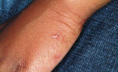 The incubation period for classic scabies is around 3 weeks, with reinfestation resulting in more immediate symptoms. The initial symptom of scabies is usually pruritus, which is often evident well before the clinical signs become apparent. Patients with scabies usually complain of worsening pruritus during nighttime hours. Infants and young children may also experience irritability and poor feeding. The skin findings include papules, nodules, burrows, and vesiculopustules ( Figs. 18-1 through 18-5 ). The most common locations for scabies lesions are the interdigital spaces, wrists, ankles, axillae, waist, groin, palms, and soles. Burrows on the palms may reveal a pattern of scale reminiscent of the wake left on a water surface by a moving boat and has been termed the wake sign. In infants, lesions may also be seen on the head ( Fig. 18-6 ), which is rarely involved in older patients. Infants commonly have involvement of the palms, soles, and axillae. In older children and adolescents, the most common sites of involvement are the wrists, interdigital spaces, and waist. Although bullous lesions are uncommon in scabies, vesicles are often found in infants and young children, owing to the predisposition for blister formation seen in this age group. Occasionally the Darier sign may be positive, and hence the diagnosis of urticaria pigmentosa may be considered. Genital involvement presenting as papules, crusted papules, or nodules ( Figs. 18-7 and 18-8 ) and areolar lesions are other classic presentation patterns. Excoriations are commonly noted.