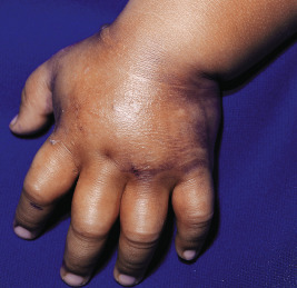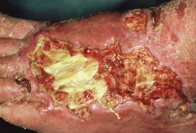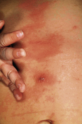 The clinical presentation of loxoscelism begins within 6 hours of the bite, usually with pruritus, pain, and/or erythema at the site. These bites, however, may be relatively painless, and patients may be unaware of them occurring, which accounts for the rarity of spider identification in diagnosing these bites. Within 24 hours, a red ring develops around the bite site and is followed by blue-purple discoloration ( Fig. 18-19 ), occasional hemorrhagic blisters, and an increase in pain. Ultimately, gangrenous ulceration with necrosis and eschar formation occurs ( Fig. 18-20 ), occasionally with bulla formation. Anesthesia is often present in the center of the affected area. A generalized petechial or morbilliform eruption may also be present. Systemic findings may include chills, fever, nausea, and joint pain. Rare findings include severe hemolysis, renal failure, and pulmonary edema. Necrotizing fasciitis has also been reported. Lymphangitis is not uncommon when the bite occurs on an extremity. In mild cases, L. reclusa bites may result only in a mild urticarial reaction. Systemic loxoscelism is uncommon overall (but when it occurs, it appears to be more common in children), and symptoms may include fever, malaise, vomiting, headache, and acute hemolytic anemia with jaundice. Renal failure rarely occurs.