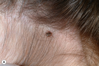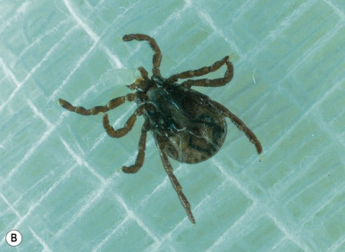 Ticks are large, globular arachnids with short legs, hard leathery skin, and mouthparts adaptable for sucking blood from mammals, birds, and reptiles. They are important vectors of diseases such as relapsing fever, rickettsial infections (Rocky Mountain spotted fever, Mediterranean spotted fever, Q fever, and ehrlichiosis; see Chapter 16 ), Lyme disease (see Chapter 14 ), babesiosis, Colorado tick fever, and tularemia. Although tick bites may be painful, the majority are painless and may go unnoticed.