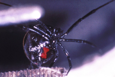 The black widow spider bites humans only in self-defense. The female spider is more dangerous than the male as a result of her larger size and more potent neurotoxin. α-Latrotoxin, the potent black widow neurotoxin, triggers synaptic vesicle release from presynaptic nerve terminals and results in its effects via exocytosis of neurotransmitters. Two red, punctate marks and local swelling are often seen, and burning or stinging with intense pain develops at the site of the envenomation. This is followed, usually within 10 minutes to an hour, by severe cramping abdominal pain and spasmodic muscular contractions, which peak in around 3 hours. Irritability, sweating, anxiety, and agitation are also common. Priapism may occur. Hypertension within the initial hours after the bite occurs in 20% to 30% of patients, and although it may be severe, it is often asymptomatic in children. Although the bite may be fatal, most children recover spontaneously in 2 to 3 days.