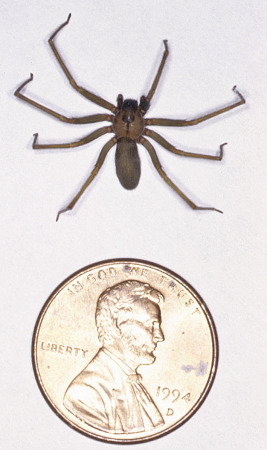 The brown recluse spider has an oval, tan to dark brown body, about 1 cm in length and 4 to 6 mm in width. A dark-brown violin-shaped marking extends dorsally from the eyes back to the distal cephalothorax ( Fig. 18-18 ), and there are three pairs of eyes, rather than the four seen in other spiders. The brown recluse spider thrives in human-altered environments such as attics, basements, and boxes. When in the house, the spider is often found in storage closets (among clothing); when outdoors, it generally resides in grasses, rocky bluffs, woodpiles, and barns. Because of its normal shyness and predilection for dark recesses, it bites only in self-defense when approached.