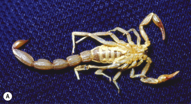 Scorpions are tropical photophobic arachnids that hide by day and hunt by night. They differ from other arachnids in that they have an elongated abdomen ending in a stinger ( Fig. 18-21, A ). Scorpions are found worldwide, particularly in the tropics, and in North America they are generally seen in the southwestern United States and Mexico. The Buthidae family are the most toxic of scorpions and are found mainly in India, Spain, the Middle East, and northern Africa. The major scorpion offender in the United States is Centruroides exilicauda (also known as Centruroides sculpturatus or the “bark scorpion”).