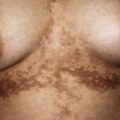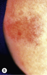 Pediculosis pubis (pubic lice, crab lice) involves primarily the pubic area but may also involve the scalp, eyebrows and eyelashes, beard, and other hairy areas. Blepharoconjunctivitis may be the presenting signs when eyelashes are involved, and this pattern has been reported in infants and children. Live lice and nits are usually seen. Itching may be the initial symptom, but in persistent cases eczematization or secondary infection may occur. A characteristic skin finding is maculae ceruleae, which are gray-blue macules on the abdomen and thighs. They are felt to represent hemosiderin deposition in the deep dermis as a result of the bites. Treatment of pubic lice is generally similar to that used for head lice (see below), as well as laundering of all clothing and bed linens. Eyelash involvement is usually treated with an occlusive agent such as petroleum jelly.