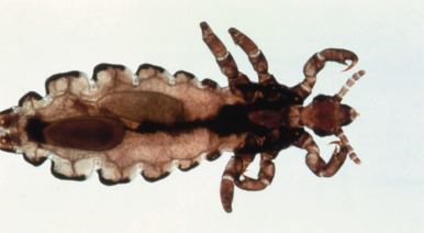 Body lice and head lice ( Fig. 18-22 ) are very similar in appearance, with elongated bodies and three pairs of claw-like legs. Pubic lice, on the other hand, have short bodies and resemble crabs in appearance. The body louse is the only louse that can carry human disease, including louse-borne relapsing fever, trench fever, and epidemic typhus. Body and head lice are transmitted by close contact or occasionally via fomites including clothing (body louse) and combs, brushes, and hats or other headgear (head louse). Pubic lice are transmitted by intimate physical contact and are considered in most cases to be a sexually transmitted disease. Nonsexual transmission of pubic lice may occur, though, and probably accounts for most cases of infestation involving the eyebrows and/or eyelashes in children, although the possibility of sexual abuse should always be considered in this setting.