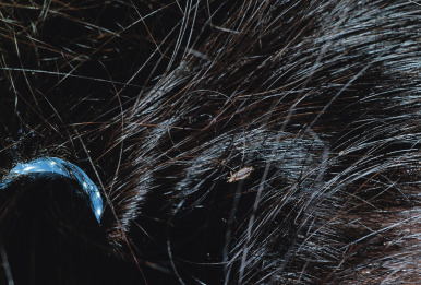 P. capitis (head lice) is by far the most common form of lice to affect children and usually affects those between 3 and 12 years of age. As mentioned, it is spread primarily through head-to-head contact and less commonly via fomites including headgear, combs, brushes, towels, and upholstery. The transmission from fomites may contribute to the increasingly challenging cycle of head-lice infestation. However, because most transmission occurs from direct contact with the head of an infested individual, the focus of control activities should be primarily on reducing the number of lice on the head and decreasing head-to-head contact. All socioeconomic groups are affected, although African-Americans are less often infested with head lice, possibly related to the diameter, shape, or twisted nature of their hair shafts (which makes grasping of the shaft more difficult for the louse). The clinical findings consist primarily of pruritus, with secondary excoriation and occasional secondary bacterial infection. Cervical and suboccipital lymphadenopathy may be present. Head lice do not transmit other infectious disease agents. The diagnosis is confirmed by finding live lice ( Fig. 18-24 ) or viable nits on the scalp. In patients in whom the diagnosis is based only on nits, their viability can be confirmed by mounting them on a glass slide and performing microscopic evaluation at low power. Viable nits have an intact operculum (cap) on the nonattached end and a developing louse within the egg ( Fig. 18-25 ).