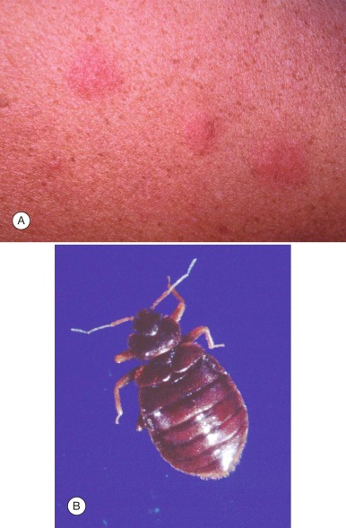 When someone is stung by an insect, the insult is usually remembered because the sting induces immediate pain. This is not always the case for biting insects; some delay may occur between the actual bite and the itching that follows. If the physical examination suggests insect bites (even when the patient is unaware of having been bitten), the history should be pursued carefully for possible exposures. For indoor exposure, fleas are common offenders. We inquire not only about pets currently living in the dwelling but also about whether pets recently occupied the premises. If a house had been occupied previously by flea-infested pets, the abandoned hungry fleas may form a welcoming party for the newly arrived human guests. We also ask about pets in homes visited by the patient. Spiders are sometimes responsible for indoor bites; their presence requires a careful search of the home. Bedbugs are becoming an increasingly recognized household insect that likes to bite in groups of three, commonly referred to as ‘breakfast, lunch, and dinner’ ( Fig. 11.2 ). Bedbugs often infest bats and birds and then hide in cracks and crevices, attacking the susceptible, sleeping victim in early morning hours. Infestations with head lice often occur epidemically in school children, so a history of affected playmates should be sought and the school nurse consulted.