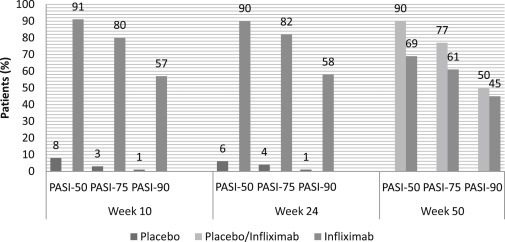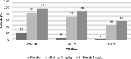 At week 10, 70% and 75% of the 3-mg/kg and 5-mg/kg group had achieved PASI-75 versus 1.9% in the placebo group. PASI-90 was achieved by 37% and 45% of the 3-mg/kg and 5-mg/kg group versus 0.5% in the placebo group.